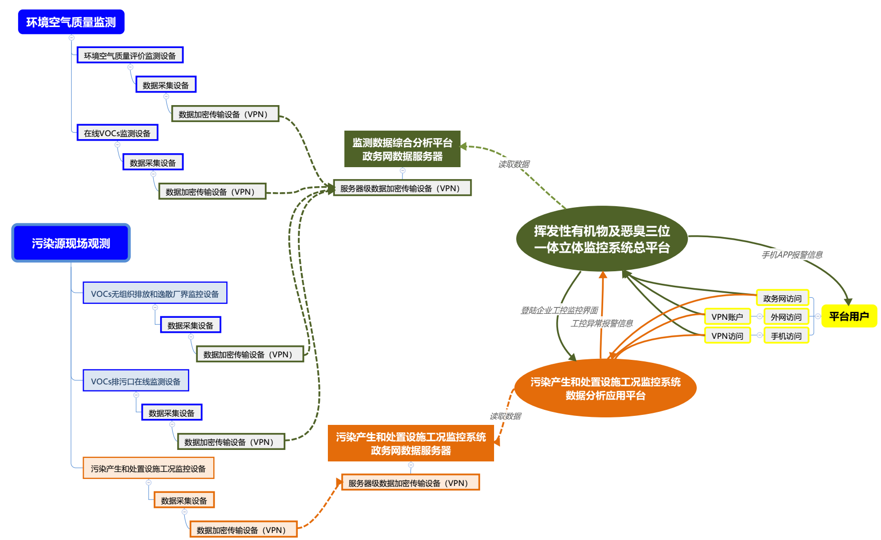 监测设备硬件作为监控系统的基础信息来源,包括污染源排放、污染传输路径和环境三方面的监测设备,形成完成的污染产生-排放-环境影响的监控链。相应的指标和配套设备根据实际监控对象确定,强调监测手段能准确反映监控对象特征和关键需求。
